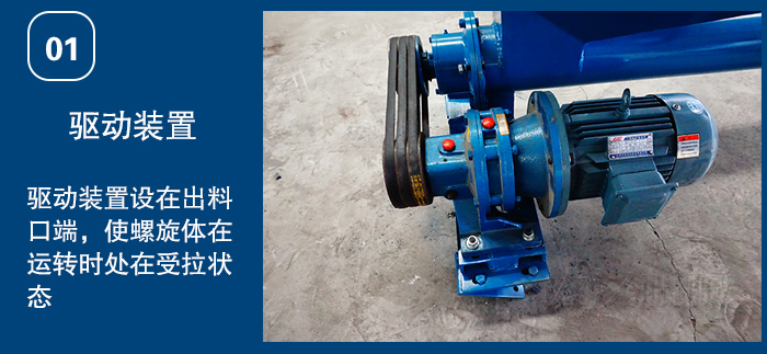 1)驅動裝置:采用擺線針輪輪減速機或軸裝式硬齒麵齒輪減速機,設計時應盡可能(néng)將驅動裝置設(shè)在出料口端,使螺旋體(tǐ)在運轉時處在受(shòu)拉狀態。頭部裝配有(yǒu)推力軸承,可承受輸送物(wù)料時(shí)產生的軸向力。