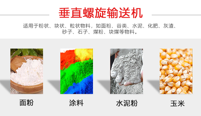 垂直螺旋輸(shū)送機(jī)適用於粉狀、塊狀、粒狀物料(liào),如麵粉、穀類、水泥、化肥、灰渣、砂子、石(shí)子、煤粉(fěn)、塊煤等物料。同(tóng)時還可用於建(jiàn)材、冶金、化工、采掘、機(jī)械製造、煤灰(huī)、糧食、食品、等(děng)行業。