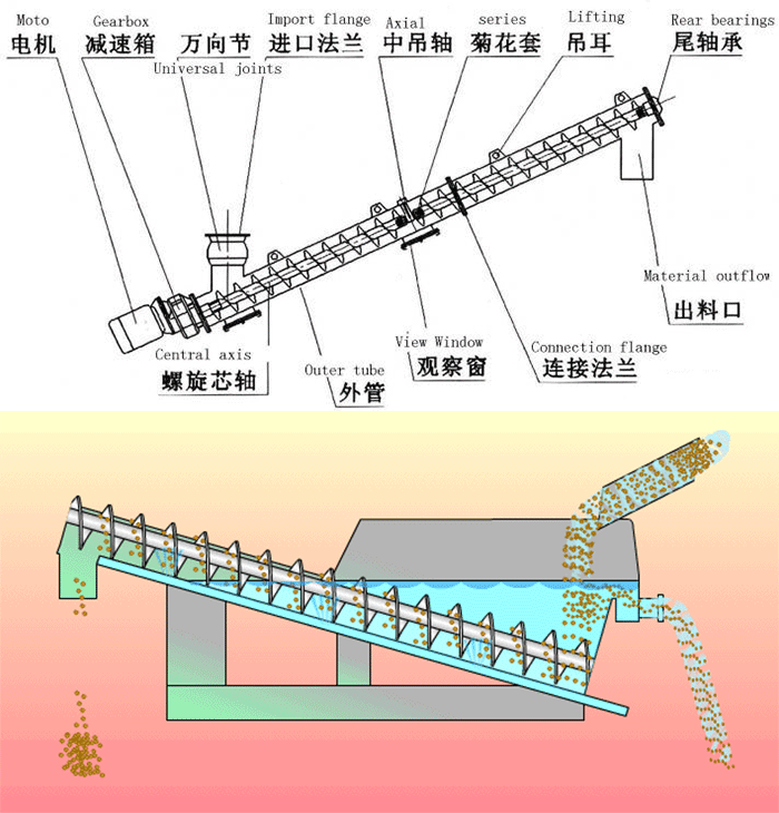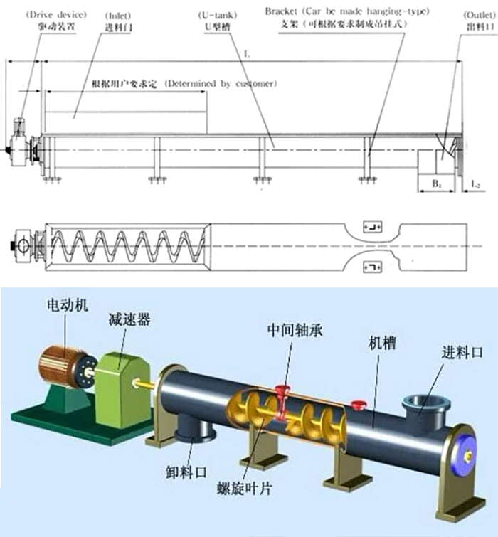 水平螺旋輸送(sòng)機是將物料均勻地喂送到下道工(gōng)序中,在(zài)驅動裝(zhuāng)置中電動機帶動減速機,再(zài)由聯軸器(qì)傳遞(dì)給螺旋軸當物料從進料口進去後,在螺旋葉片的作用下將物料均勻輸(shū)出。