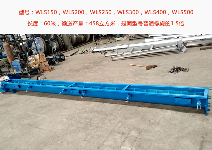 無軸螺旋輸送機常(cháng)規型號有WLS150,WLS200,WLS250,WLS300,WLS400,WLS500等6種規格可選,單機長度60米,輸送產量高達458立方米,是同型號普通螺(luó)旋的1.5倍;可輸送帶狀、黏稠物料、易纏繞物料;具體參數如下: