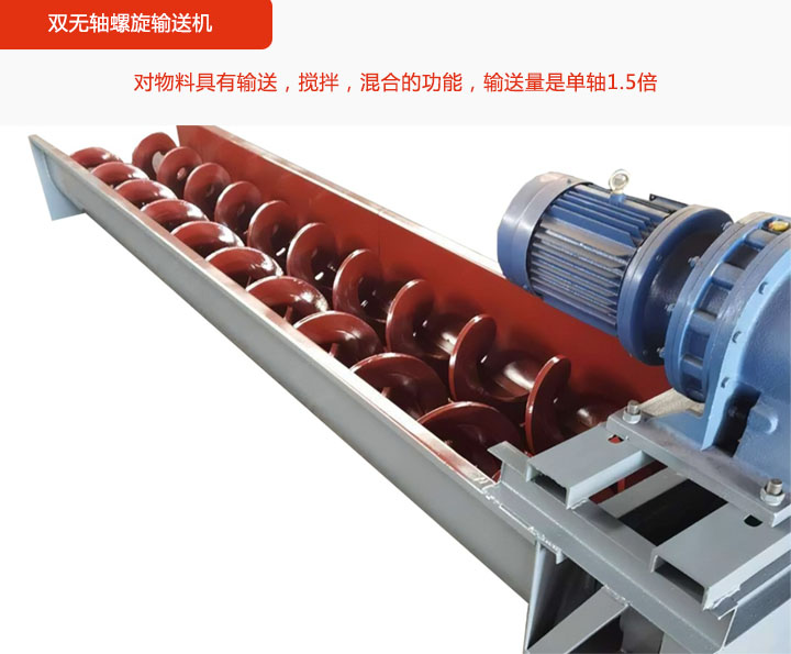 雙無軸螺旋輸送機(jī):采用兩根(gēn)螺旋軸組成,且軸旋轉方向相反,輸(shū)送物料同時還(hái)可對物料攪拌,混合,其輸送量是單軸1.5倍