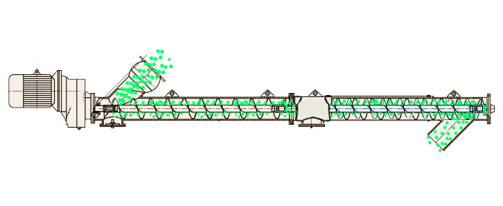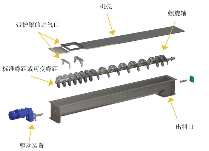 水平螺旋(xuán)輸(shū)送機:螺旋軸與水平麵的夾角小於15°布置的LS螺(luó)旋輸送(sòng)機。水(shuǐ)平螺旋輸送機用於水平輸送物料。  傾斜螺旋輸送機:螺旋軸與水平(píng)麵的夾角大於15°,小於90°布置的LS螺旋輸送機。傾斜螺旋輸送機用於將物料輸送至較高位置。  垂直螺旋輸送機:螺旋軸與(yǔ)水平麵垂直(zhí)布(bù)置的LS螺旋輸送機。垂直螺旋輸(shū)送機用於將物料提升至更高位置。  按螺旋軸分類:    螺旋(xuán)輸送機按螺旋軸一般分為有軸螺旋輸送機、無軸螺(luó)旋輸(shū)送機兩(liǎng)種。  有軸螺旋輸(shū)送機: 指螺旋軸(zhóu)固定在機殼內的(de)螺旋輸送機,物料通過螺旋軸的旋轉推動向前移動。這種類型結(jié)構較為簡單,成本較低,適用於輸送粉末、顆粒、片狀等物(wù)料。  無軸螺旋輸送機: 指沒有固定螺旋軸的螺旋輸送機。其利用機殼內壁上的螺旋槽將物料推向出口。這種(zhǒng)類型結構更加(jiā)複雜(zá),成本較高,但具有更強的適應性,適用於輸送易碎、易堵塞的物料。  按螺旋葉片分類:    螺(luó)旋輸送機的螺旋葉片有實體螺旋麵型、帶式螺旋麵型及葉片螺(luó)旋麵型三種。  實體螺旋麵稱S製法,其螺旋節(jiē)距(jù)GX型為葉片直徑的0.8倍,適用於輸送(sòng)粉狀和(hé)粒狀物料。  帶式螺旋麵又稱D製法,其螺(luó)旋節距與(yǔ)螺旋葉片直徑相同,適用(yòng)於輸送粉狀及小塊物料。  葉片式螺(luó)旋麵應用較少,主要用於輸(shū)送粘度較大和可壓縮性物料,其螺旋節距約為螺旋葉片直徑的1.2倍。  螺旋輸送機應用場景非常廣泛,幾乎涵蓋了(le)各個工業領域。以下列舉一些常見的應用場景,並進行詳細介紹:    食品行業:  糧食加(jiā)工: 輸送小麥、稻穀(gǔ)、玉米等糧食原料,用於清理、烘幹、粉碎等環節。  麵粉加工: 輸送麵粉、澱粉等粉狀物料,用於(yú)混合、包裝等環節。  糖(táng)果、糕點(diǎn)生產: 輸送糖(táng)、巧克力、麵粉、果仁等原料,用於混合(hé)、配(pèi)料、包(bāo)裝等環(huán)節。  飲(yǐn)料生產(chǎn):輸送糖、香精(jīng)、粉末等(děng)原料,用於配料、混合等環節(jiē)。  化工行業:  化工原料輸(shū)送:輸送粉末、顆粒、片狀等(děng)化工原料,用於生產、包裝、儲存等環(huán)節。  塑料加工: 輸送塑料(liào)顆粒、粉末等,用於生(shēng)產、混合、儲存等(děng)環節。  醫藥生產:輸(shū)送藥粉、藥片(piàn)、顆粒等醫藥原料,用於配料、混合、包裝等環節。  建材行業:  水泥(ní)生產:輸送水泥粉末、熟料、礦渣等,用(yòng)於生產、包裝、儲存等環節。  砂石加工:輸送沙子、石粉(fěn)、石子等,用於生產、包裝、儲(chǔ)存等環節。  陶瓷生產:輸送陶瓷粉末、粘土等,用於生產、包裝、儲存等環節。  冶金行業:  礦(kuàng)石輸送:輸送各種礦石,用於(yú)冶煉、加工等環節。  粉末冶金:輸送金屬粉末,用於生產(chǎn)、混合、包(bāo)裝等環節。  其他(tā)行業:  農業:輸送糧食、肥料、種子等,用於農業生產、加工、儲存(cún)等環節。  物流:輸送各種貨物,用於倉儲、配(pèi)送等環(huán)節。  環保:輸送固(gù)體廢棄物,用於(yú)回收、處理等環節。    螺旋(xuán)輸送機(jī)的工作原理(lǐ)是利用螺旋(xuán)軸的旋轉,帶動螺旋葉片將物料(liào)推向機殼的出口(kǒu)。螺旋軸通常由金屬製成,呈螺旋狀,安裝在(zài)機殼內(nèi)。當電機驅動螺旋軸(zhóu)旋轉時,螺旋葉片會將物料推(tuī)向螺旋軸旋轉(zhuǎn)的方向,從而實現物料的輸(shū)送。螺旋(xuán)輸送機可以水平、傾斜或垂直安裝,根據螺旋軸的旋轉方向可以實現正向輸(shū)送或反向(xiàng)輸送。通過調節螺旋軸的(de)轉速和螺距可(kě)以控製(zhì)物(wù)料的輸送量和輸送(sòng)速(sù)度。  螺旋(xuán)輸送機主(zhǔ)要(yào)由以下(xià)部件組成:    機殼: 機殼通常由鋼板或鋼(gāng)管製成,用於包裹螺旋軸(zhóu)和物料,起到支撐和保護作用。  螺旋軸: 螺旋軸是螺旋輸(shū)送機的核心(xīn)部件,由金屬材(cái)料製成,呈螺旋狀,安裝在機殼內,通過旋轉推動物料。  驅動裝置: 驅動裝(zhuāng)置通常包括電機、減速器、聯軸(zhóu)器(qì)等,用於為螺旋軸提供動力。  軸承: 軸承用(yòng)於支撐螺旋軸,減少摩擦,保(bǎo)證螺旋軸的正常旋轉。  進料口: 物料進入螺旋輸送機的入口。  出料口: 物料從螺旋輸送機出來的出口。  其他部件: 根據需要還可能包(bāo)括導向裝(zhuāng)置、清掃(sǎo)裝置、密封裝置等。      螺旋軸與水平麵的(de)夾角小於15°布置(zhì)的LS螺旋輸送機(jī)。    螺旋軸與水平(píng)麵的夾角大於15°,小於90°布置的LS螺(luó)旋輸送機。    螺旋軸與(yǔ)水平麵垂直布置的LS螺旋輸送機。    可彎曲螺旋輸送機  螺旋軸及葉片由可彎曲撓性構件組成的LS螺旋輸(shū)送機。    具有行走機構,可以(yǐ)整(zhěng)機移動(dòng)的(de)螺旋輸送機(jī)。    彈簧螺旋輸(shū)送機  以撓性螺旋(xuán)彈簧作為輸送構件的LS螺旋輸送機。    具有兩根(gēn)相互平行、分別為左右方向旋轉的螺旋的LS螺旋輸送機。    件(jiàn)貨螺旋輸送機  無載料槽,有兩(liǎng)跟相互平行、轉速相同、方(fāng)向相反的左右螺旋組成。用於輸送成件物品的LS螺旋輸送機。    具有內螺旋而自身又能旋轉的螺旋輸料管的(de)螺旋輸送機。    螺旋輸送機在(zài)使用(yòng)時需要滿足(zú)一定的條件,才能保證設備的正(zhèng)常運行和使用壽命。以(yǐ)下是螺