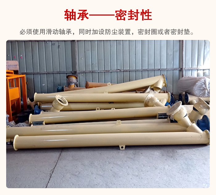 管型(xíng)螺旋輸送機必須使用滑動軸承,同時加設防塵裝置,密封圈或者密封墊(diàn),這樣不會導致