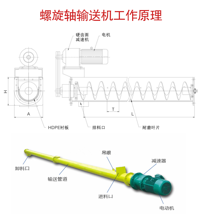 螺旋軸輸送機主要(yào)由驅動裝置(zhì),機殼、蓋板、螺旋軸、螺旋(xuán)葉片、進料口、出(chū)料口等(děng)部件組成。