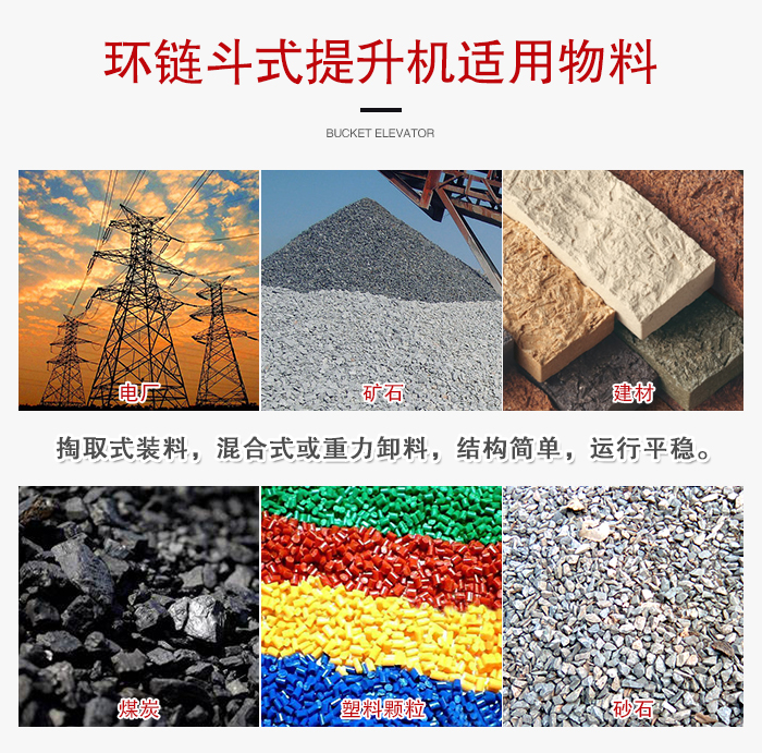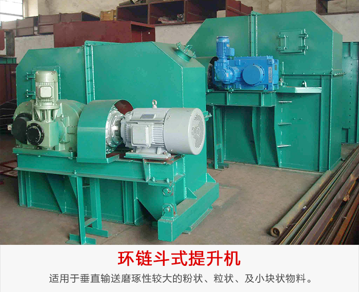 環鏈鬥式提升機適用於垂直輸送磨琢性較大的粉狀、粒狀、及小塊狀物料,如糧食、煤、水泥、碎礦石等,輸送高度不超過40m,其特點為,結構(gòu)簡單,運(yùn)行平穩,掏取式裝料,混合式或重力(lì)卸料,輪緣采用(yòng)組合鏈輪,更換方便,鏈輪輪(lún)緣經特殊處理壽命長,下部如采用重力自動張緊(jǐn)裝置,能保(bǎo)持恒定的張力,避免打滑或脫鏈,同時在料鬥遇阻時,有一定的容讓性能(néng)夠(gòu)有效地保護運動(dòng)部件,物料溫度不超過250℃。