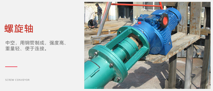 螺旋軸:中(zhōng)空,用鋼管製成,強度高、重量(liàng)輕、便於(yú)連接。在(zài)軸與軸的連接處和安(ān)裝軸承處使用一小段實(shí)心軸。在連接處將實心軸伸入空心軸內用高強度的螺栓(shuān)按(àn)相互垂(chuí)直方向對(duì)穿空心軸與實心軸來固定連(lián)接(jiē)螺旋軸。
