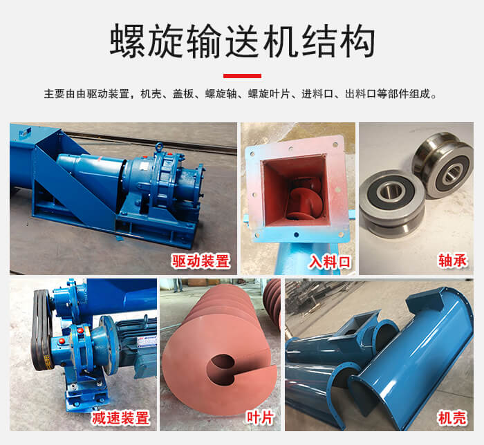 主要由由驅動裝置,機殼、蓋板、螺旋軸、螺旋葉片、進料口、出料口等部件組成。