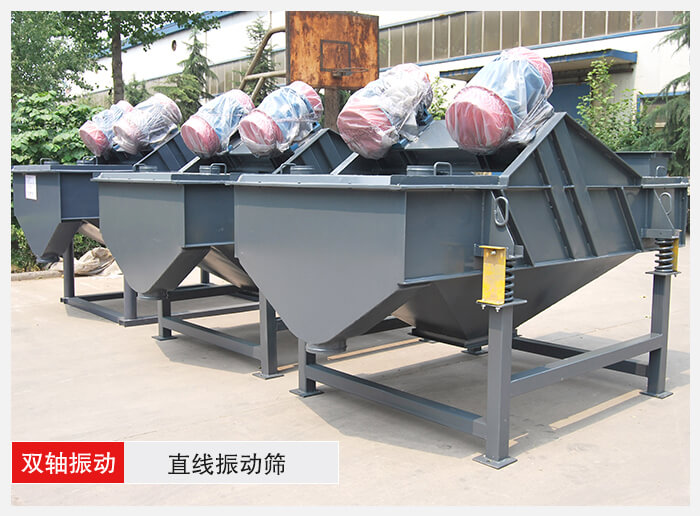 雙軸振動篩是(shì)利用同步異(yì)向回轉(zhuǎn)的雙不平衡重激振(zhèn),篩麵水平或(huò)緩傾(qīng)斜,篩箱的運動軌跡為直線。