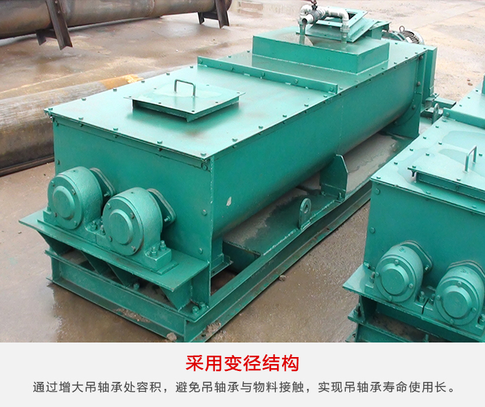 雙軸螺旋輸(shū)送機采用變徑結構,通過增(zēng)大吊軸承處容積,避免吊軸承與物(wù)料接觸,實現吊軸承壽命可達到(dào)兩年以上。