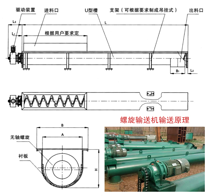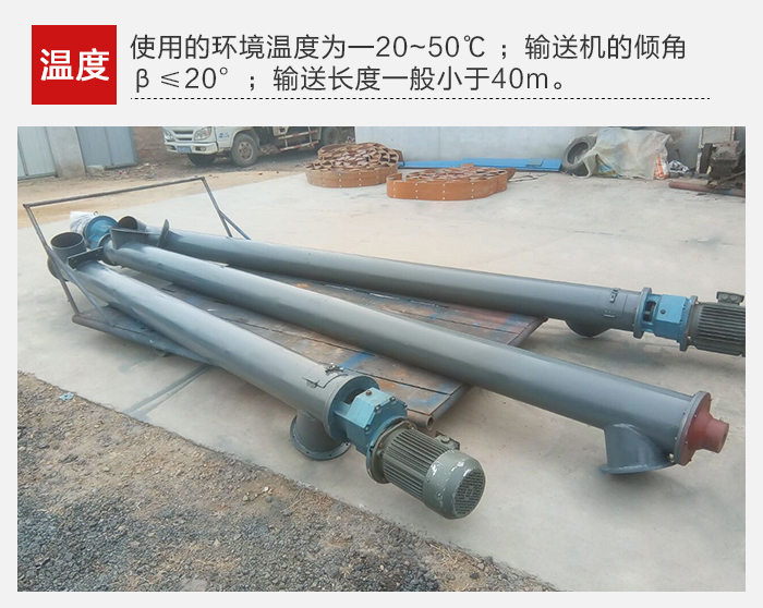 2、螺旋(xuán)輸送機使用的環境溫(wēn)度為(wéi)—20~50℃ ;輸送機的傾角β≤20°;輸送長度一(yī)般小於40m,最長不超過70m。