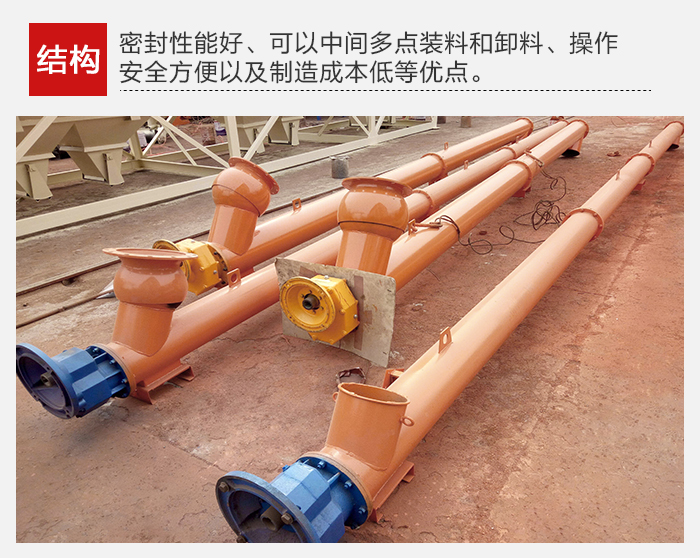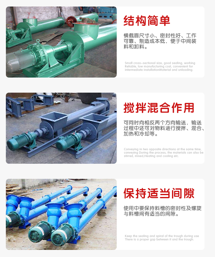 結構(gòu)簡單、橫截麵尺寸小、密封性好(hǎo)、工作可靠、製造成本低(dī),便於中間裝料(liào)和卸料,輸送方向可逆向,也可同時向相(xiàng)反兩個方(fāng)向(xiàng)輸送。輸送過程中還可對物料進行攪拌、混合、加熱和冷卻等作業。通過裝卸閘(zhá)門可調(diào)節物料流量。但不(bú)宜(yí)輸送易變質的(de)、粘性大的、易結塊的及大塊的物料。輸送過程(chéng)中物料易破碎,螺旋及料槽易磨損。單位功率較大。使用中要保持料槽的密封性(xìng)及螺(luó)旋與料槽間(jiān)有適當的間隙。