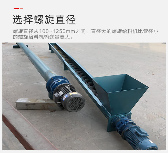 螺(luó)旋給料機(jī)螺旋直徑從100~1250mm之間,選擇不同的管徑對於(yú)單位時間輸送量是有直接的影響的,直徑大的(de)螺旋給(gěi)料機比管徑小的螺旋給料機輸送量更大。