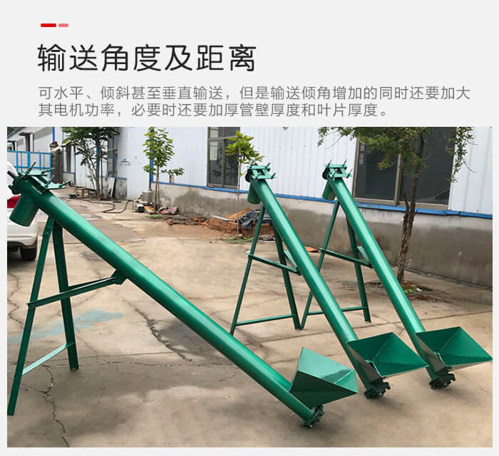 螺旋給料機可以水平、傾斜甚至垂直輸送(sòng),但是輸送(sòng)傾角(jiǎo)增加的同時還要加大其電機功率,必要(yào)時還要加厚管壁厚度和葉片厚度(dù)。