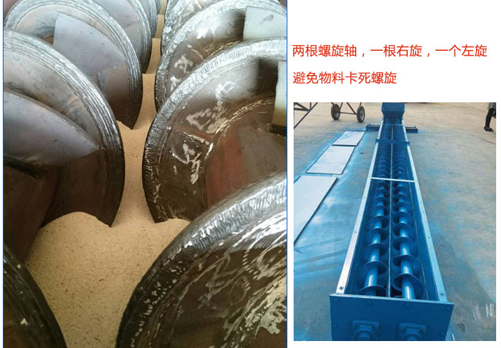 雙螺旋輸送(sòng)機(jī)擁有兩(liǎng)根(gēn)螺旋軸,旋轉方向相反(一根右旋,另一個左旋),能有效避免物料卡死螺旋,輸送中不(bú)會出現卡料和堵料(liào)的現象。