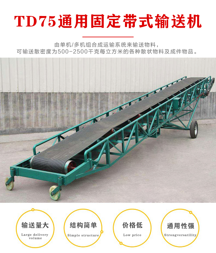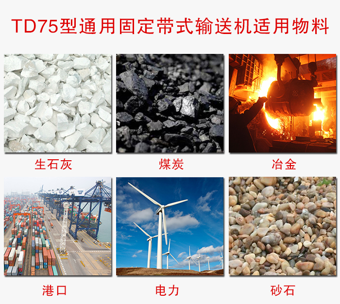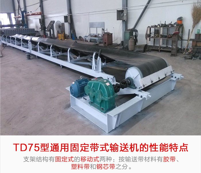 TD75通用固定帶(dài)式輸送機由於輸送量大、結構簡單、維護方便(biàn)、成(chéng)本低、通用性強等優點,而被(bèi)廣泛地應用在冶金、礦山、煤(méi)炭、港口、交通、水電、化工等部門進行裝車(chē)、裝船、轉載或堆積各種常溫(wēn)狀態(tài)的鬆散密度為500~2500kg/m3各種散狀物料或(huò)成件物品。