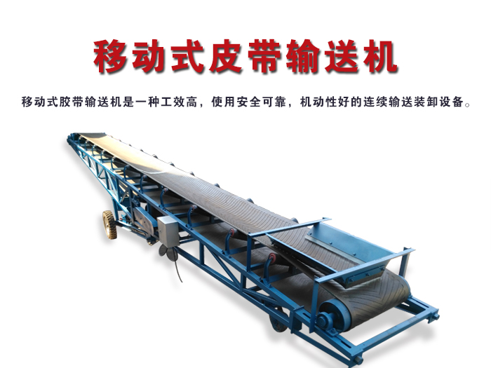 移動式皮帶輸送機是一種工效高,使用安全可靠,機動性好的連(lián)續輸(shū)送裝卸設備。主要用於裝卸地點經常變更(gèng)動(dòng)的場所,如:港口(kǒu)、碼頭、車站、煤場、倉庫、建築工地、沙石料場(chǎng)、農場等,用來短途運輸及裝(zhuāng)卸散料(liào)或單件(jiàn)重量100公斤以下的成件物品。