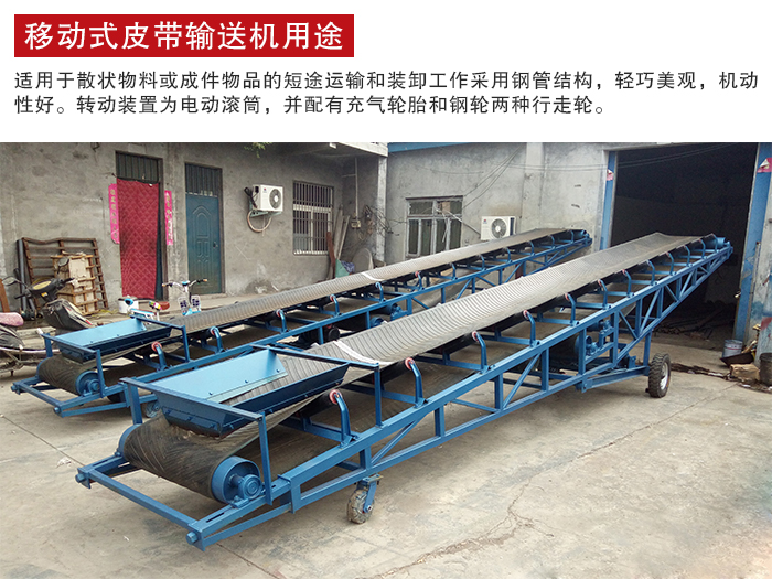移動式皮帶輸送機適用於散狀物料或成件物品的短途運(yùn)輸(shū)和裝卸工作。采用鋼管結構,輕巧美觀,機(jī)動性好。轉動(dòng)裝置為電動滾筒,並配有充氣輪胎(tāi)和鋼輪(lún)兩種行走輪。機長10米以上且傾角可以調整。