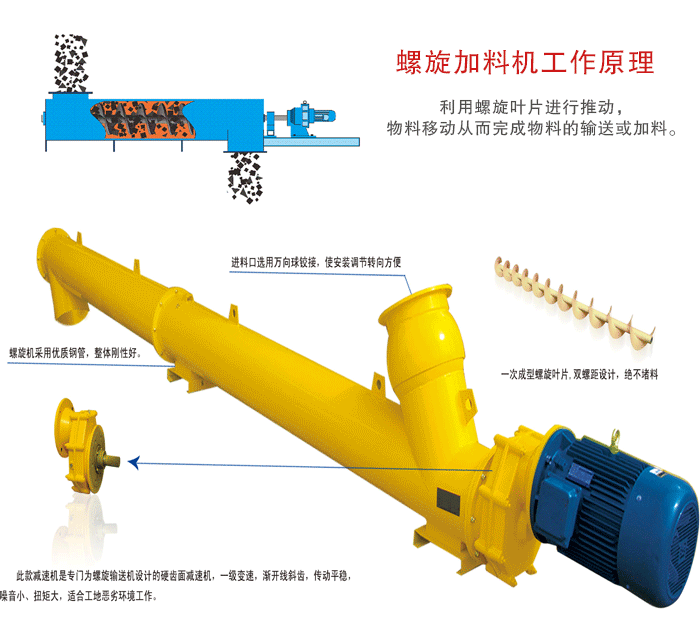 螺旋(xuán)加料機主要的輸送角度為傾(qīng)斜0°到45°之間(jiān)大於(yú)45°就不(bú)能(néng)完成自由調整角度的功能,主要的(de)輸送原理是(shì)利用螺(luó)旋葉片進行推動,物料移動從而完成物料的輸送(sòng)或加料。