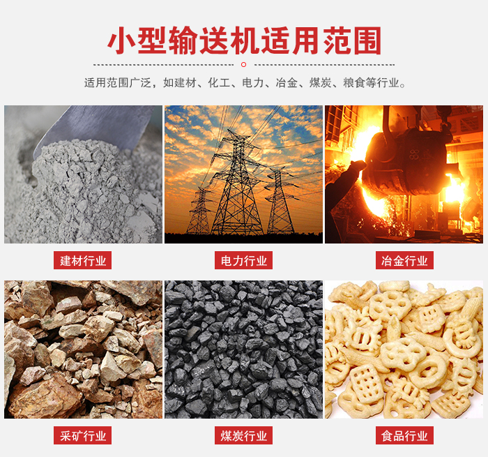 適用物料:粉狀、粒狀和小塊狀物料,如煤、灰、渣(zhā)、水泥、糧食(shí)等